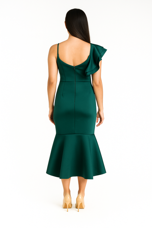 Step into sophistication with this luxurious bottle green bodycon dress, expertly crafted to highlight your natural curves. The dress features elegant bottom frills, adding a touch of feminine charm to the form-fitting silhouette. A chic waist belt cinches your waist, accentuating the design’s graceful contours. The asymmetrical top makes a bold statement, with one side adorned with a delicate ruffle and the other showcasing a sleek strap, blending contemporary style with timeless elegance. The back zip opening ensures an easy fit without compromising the sleek, polished appearance.