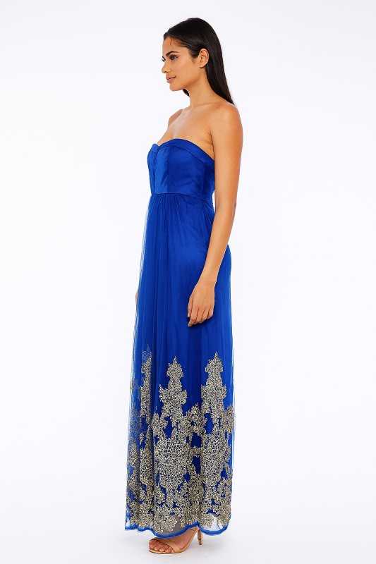 Step into elegance with this luxurious cobalt blue strapless belted gown, a stunning choice for formal occasions and evening events. The gown features intricate machine embroidery, adding a layer of texture and detail to the rich blue fabric. Beautifully adorned with beads, it catches the light in all the right places, giving you a shimmering, glamorous look. The strapless design highlights your shoulders and neckline, while the belt cinches the waist, accentuating the gown’s flattering shape. A side zip opening ensures a comfortable and seamless fit, making it easy to slip into this stunning creation.