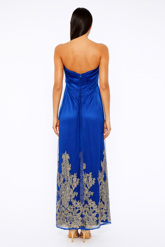 Perfect for upscale events like galas, weddings, or black-tie affairs, this gown offers both sophistication and modern elegance. The combination of embroidery and beads creates a sense of timeless luxury, while the cobalt blue color adds a bold statement to your look. Pair it with delicate jewelry, a sleek clutch, and your favorite heels to complete your ensemble and make a lasting impression. A must-have for those who appreciate the finer details in fashion, this gown is sure to turn heads at any formal event.