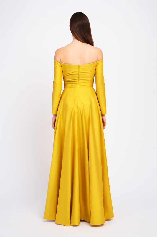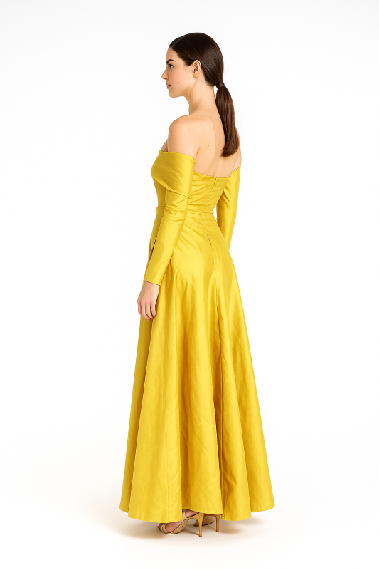 Crafted from luxurious silk fabric, this gown exudes both elegance and comfort, with a rich yellow hue that captures attention and radiates warmth. Whether you’re attending a formal gala, an exclusive party, or a wedding celebration, this gown ensures you’ll stand out in the crowd. The combination of off-shoulder design, pleated draping, and long trail makes this piece an exceptional choice for creating unforgettable memories at any special event.