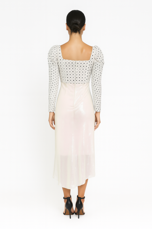 Exude elegance with this "White Western Gown," a timeless creation perfect for making a statement at any grand occasion. Featuring intricate embroidery and dazzling mirror work, this gown blends classic craftsmanship with contemporary design. The sequin-draped detailing adds a touch of luxury, while the full puff sleeves offer a regal and sophisticated appeal. A back zip opening ensures a snug yet comfortable fit, making it both stylish and practical.